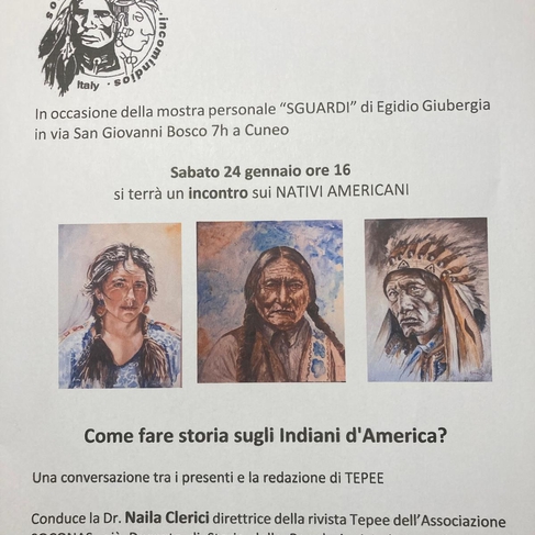 Sabato 24 gennaio alle ore 16 in via San Giovanni Bosco 7h a Cuneo in occasione della mostra personale "SGUARDI" di Egidio Giuberga si terrà un incontro sui NATIVI AMERICANI: "Come fare storia sugli Indiani d'America ?"