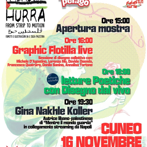Domenica 16 novembre – dalle ore 15.00 ArciPelago Cuneo – C.so Giolitti 31 (ingresso Via Meucci 32) Una giornata dedicata all’arte, al fumetto e alla poesia per raccontare la Palestina e il suo immaginario, attraverso segni, parole e incontri che uniscono.